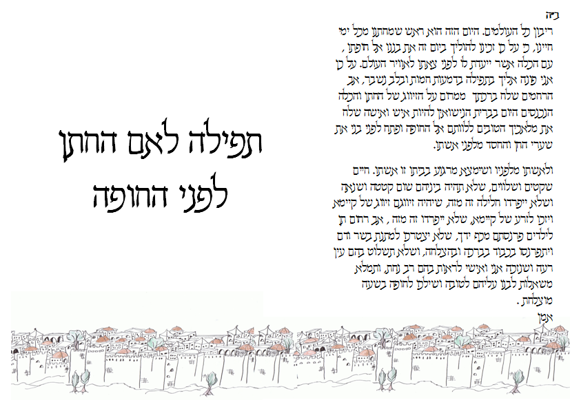 Heavenly Father, I, Saradaughter of Sara, stand before you todayready to marry to Israel son of Israel in holiness and purity by means of the Chupah and the Seven Blessings. May it be Your will that I marry this man under the Chuppah with a Good Sign and in Good Fortune for all time, and may we live in love and peace, holinessand purity through Your will and rejoice and be happy together with children and all Your blessings. May we have love and happiness as was found in the Garden of Eden.